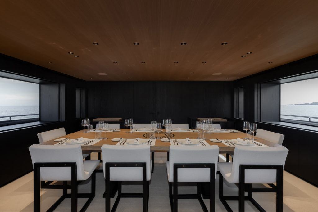 The owner further requested the main salon to be as large as possible, which is why it was decided to move the dining room to the upper deck, where there are two dining tables, one interior and one on the open aft deck, which can both seat a full complement of guests.