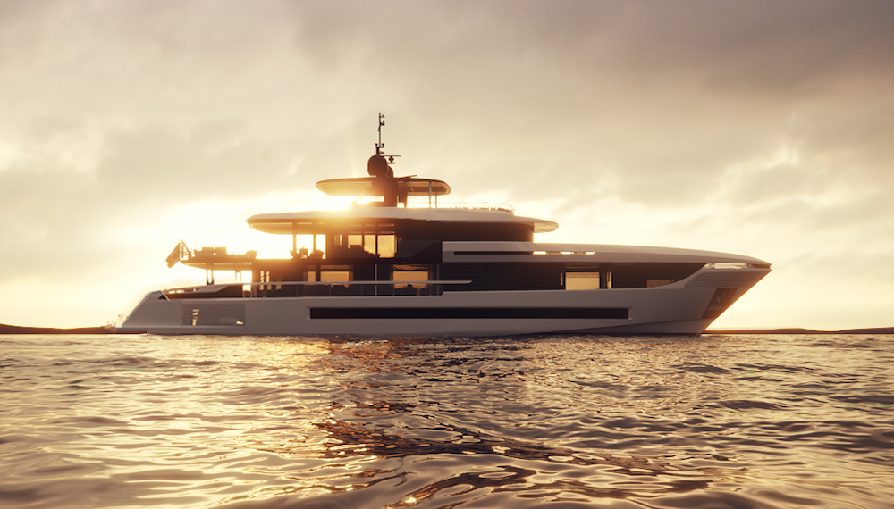 A tri-deck yacht that embodies an innovative way of experiencing onboard life, forging a brand-new concept of open spaces and direct contact with the sea thanks to a minimal superstructure and the most extensive use of glass. The uttermost consistency between the yachts’ interiors and exteriors creates the effect of the patio of a modern, seaside glass villa. Interior design is minimal and yet warm and cozy, and the foldable terraces can be lowered to provide access to a 180° beach house/garage tailored to the Owner’s taste and requirements.