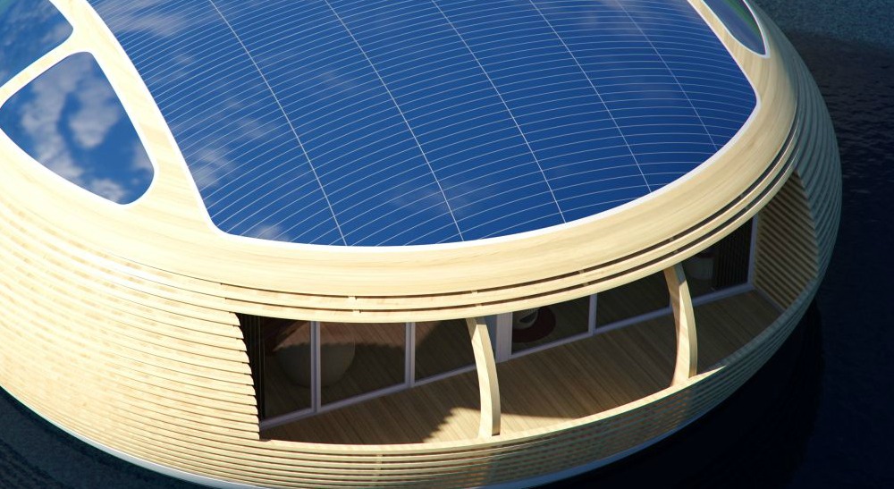 With a surface area of 100 square meters enclosed in a nearly circular involucre, 12 meters in diameter and 4 meters high made with recycled materials such as wood laminate and an aluminum cover, WaterNest 100, with its flexible design and adaptability to any environment, is constructed for those who want to live in a house with low energy consumption and close contact with nature while protecting the environment. WaterNest 100, which is connected to the mainland by a long pier, is characterised by the presence of large balconies surrounding the property that welcomes the interior from which you can enjoy the view thanks to the large windows. The interior, widely adaptable to individual needs, can be arranged as a household with two bedrooms, a large living room, a kitchen and two bathrooms, or as an office (with a meeting room, archive, two workstations and a separate bathroom), as shop (with exhibition space, office and warehouse) or as a lounge bar with 36 seats, a kitchen and two bathrooms. As for the energy needs WaterNest 100 is self-sufficient thanks to 60 square meters of solar panels placed on the roof that produce 4 kWp. The furnishings designed to WaterNest 100, selected in the catalog EcoFloLife have a very contemporary design, with an eco-friendly structure and meet the most demanding requests. WaterNest 100 can be located along rivers, in lakes and in sea areas with calm waters, such as bays and lagoons. The use of materials and sustainable production systems make WaterNest 100 98% recyclable.