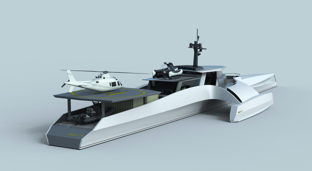 Nigel Irens Design, the pen behind ocean-going multihulls of the likes of Idec, in which Francis Joyon set the solo round the world sailing record, has now produced an explorer yacht called the Xplore 70. The 70-metre will build at Constructions Mécaniques de Normandie and can accommodate 10 passengers and eight crew. On its deck is space for a mini-submarine and a six-metre tender amongst other things. Irens was flanked by his longtime collaborator Christophe Chedal-Anglay on the project and describes it thus: