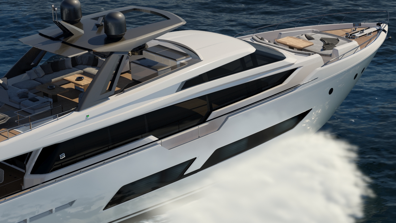 while the second is the Ferretti 850, a 26-meter flybridge, characterized by sharp and sporty lines, that already shows several design elements that will recur and define the whole brand’s largest range.